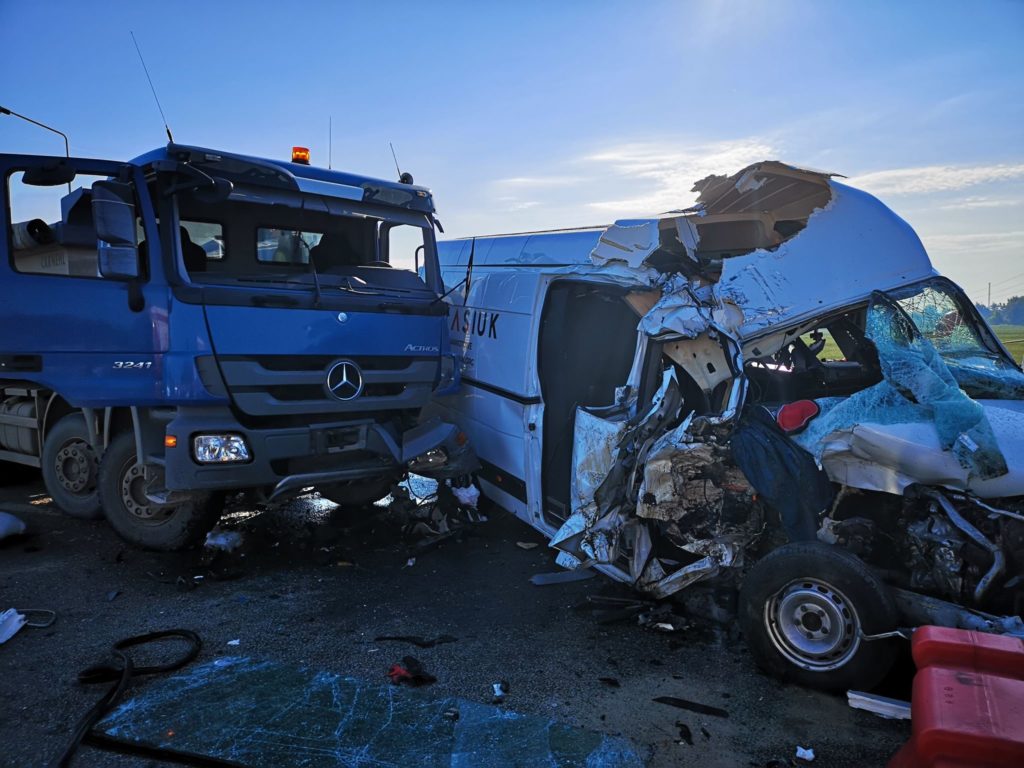 Ciężarówka przewożąca kruszywo zderzyła się z busem którym podróżowało 6 osób. Droga A1 zablokowana jest w obu kierunkach. Na miejscu był śmigłowiec Lotniczego Pogotowia Ratunkowego.