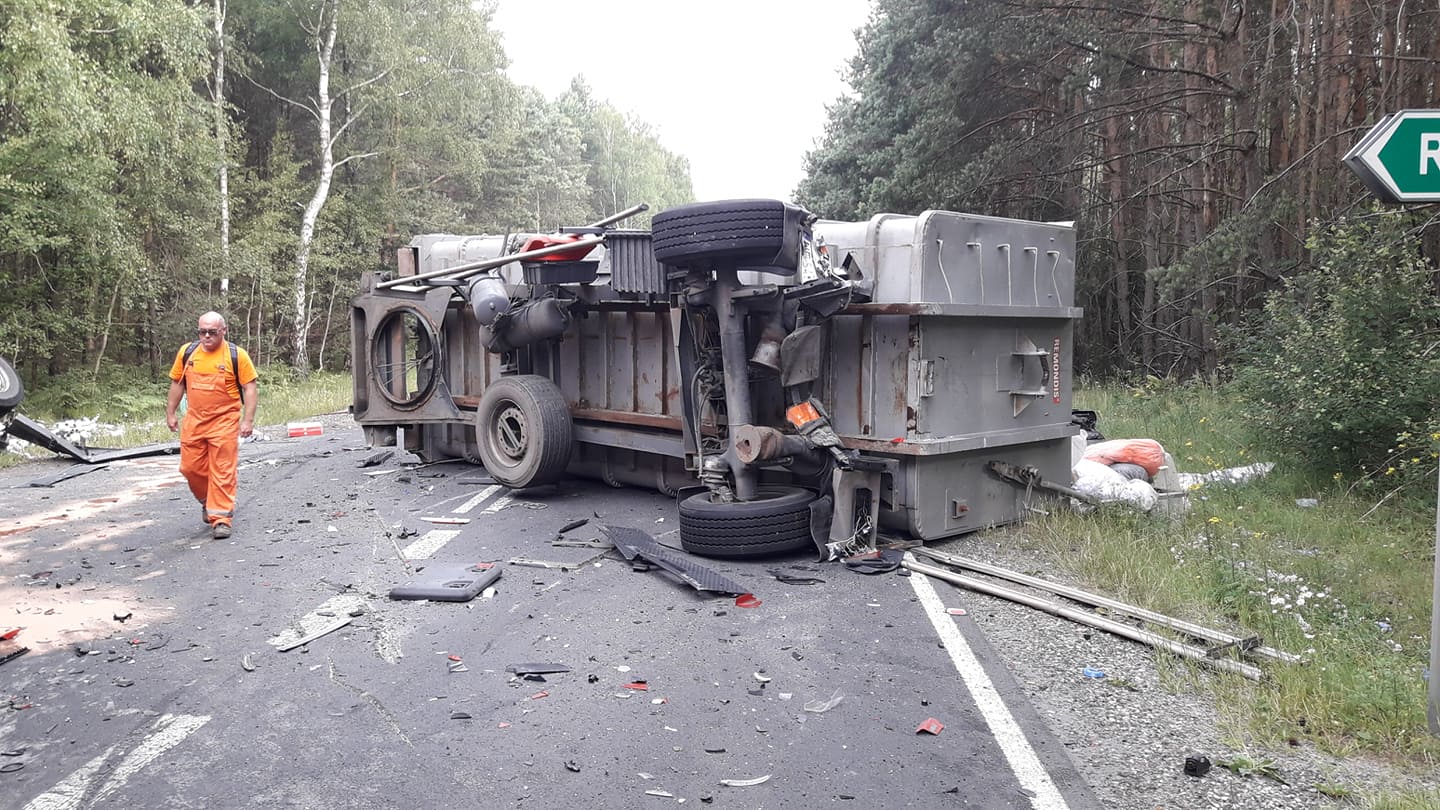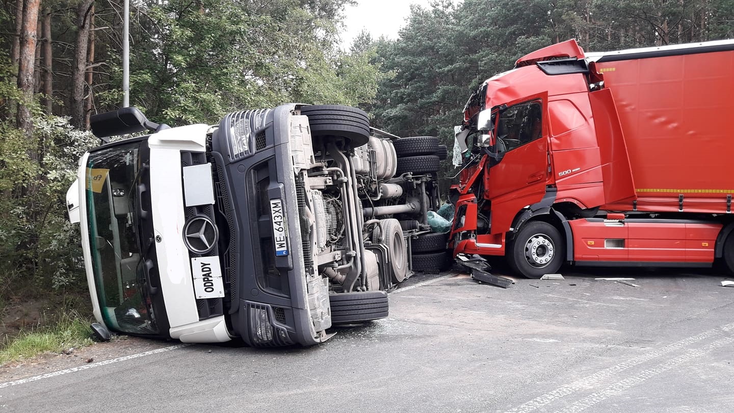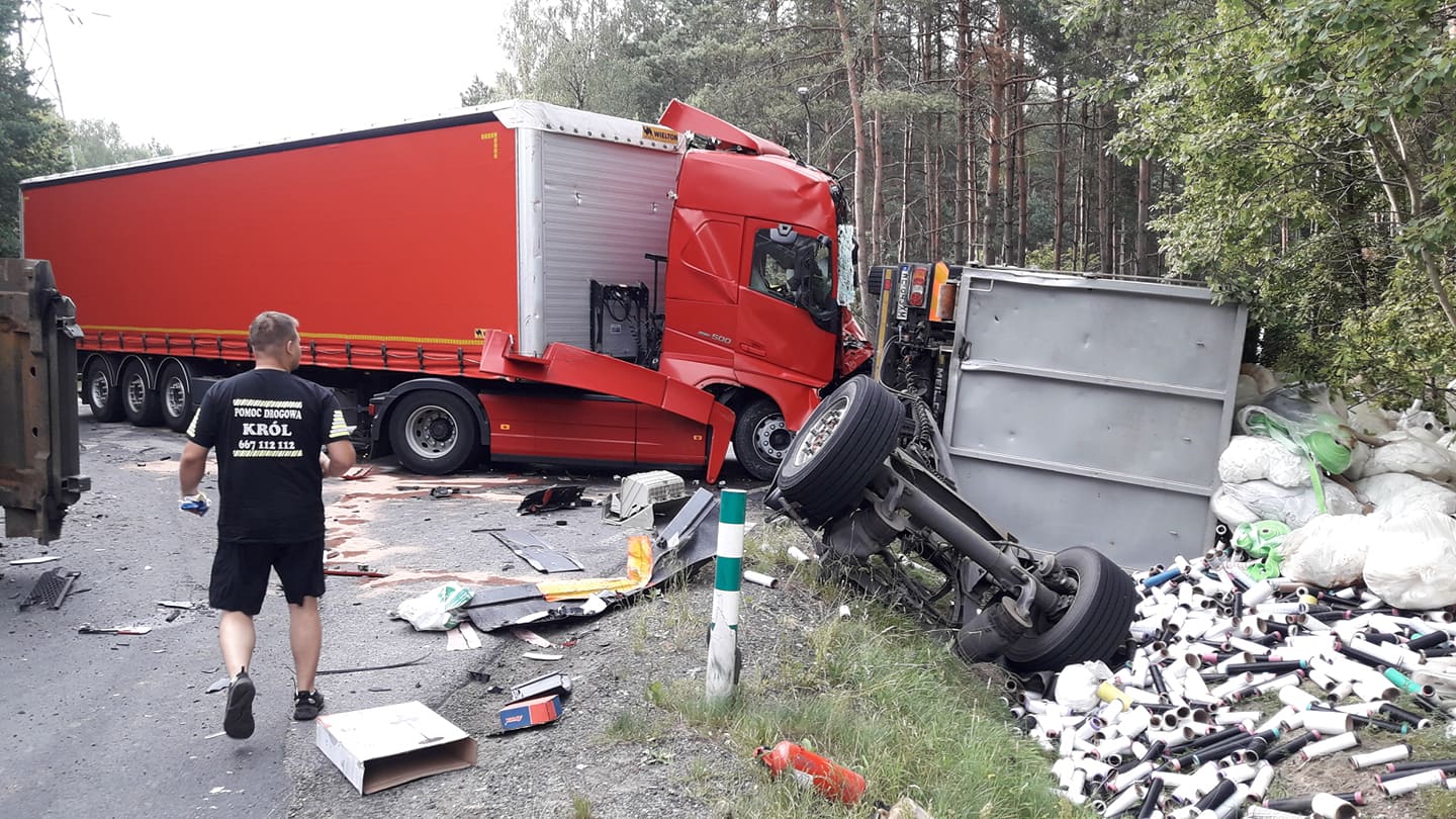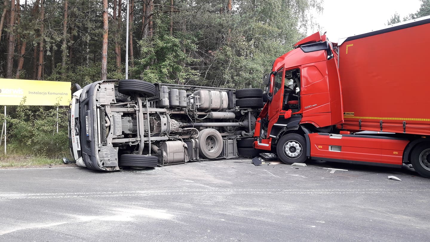 – Kierujący volvem 39-letni mieszkaniec powiatu grodziskiego, nie zachował bezpiecznej odległości od poprzedzającego go ciężarowego mercedesa skręcającego w lewo, i najechał na tył jego naczepy. W efekcie czego ciężarówka wraz z naczepą przewróciły się, a ładunek jaki przewoził pojazd, wysypał się na jezdnię. Kierujący uczestniczący w zdarzeniu byli trzeźwi. Sprawca z obrażeniami ciała został przewieziony do szpitala. Droga od kilku godzin jest zablokowana, a uprzątanie potrwa prawdopodobnie do godzin południowych. – informuje asp. Agnieszka Kropisz z Komendy Powiatowej Policji w Radomsku.