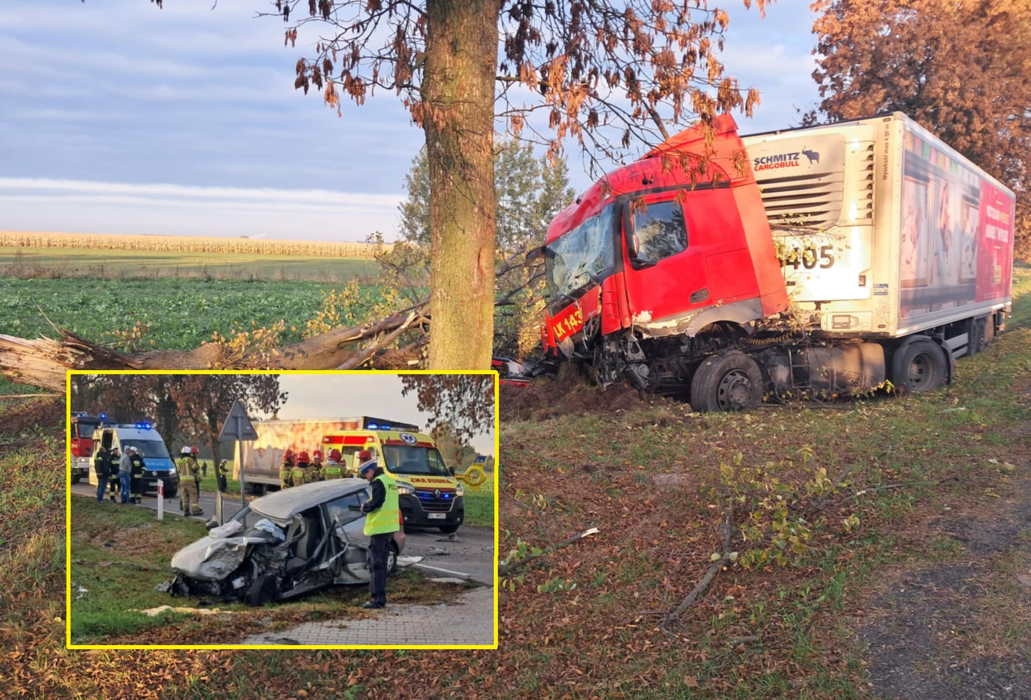 Do wypadku doszło około 7:30 na DW 473 w miejscowości Szydłów-Kolonia w gminie Grabica. Kierująca samochodem osobowym, 60-letnia kobieta, jechała Skodą od strony Piotrkowa Trybunalskiego. Z przeciwnego kierunku jechał kierujący ciężarówką. W pewnym momencie, osobówka zjechała na przeciwległy pas ruchu. Kierowca tira nie miał szans na uniknięcie zderzenia. Najpierw doszło do kraksy z osobówką, a następnie ciężarówka zjechała na prawo, i uderzyła w przydrożne drzewo.