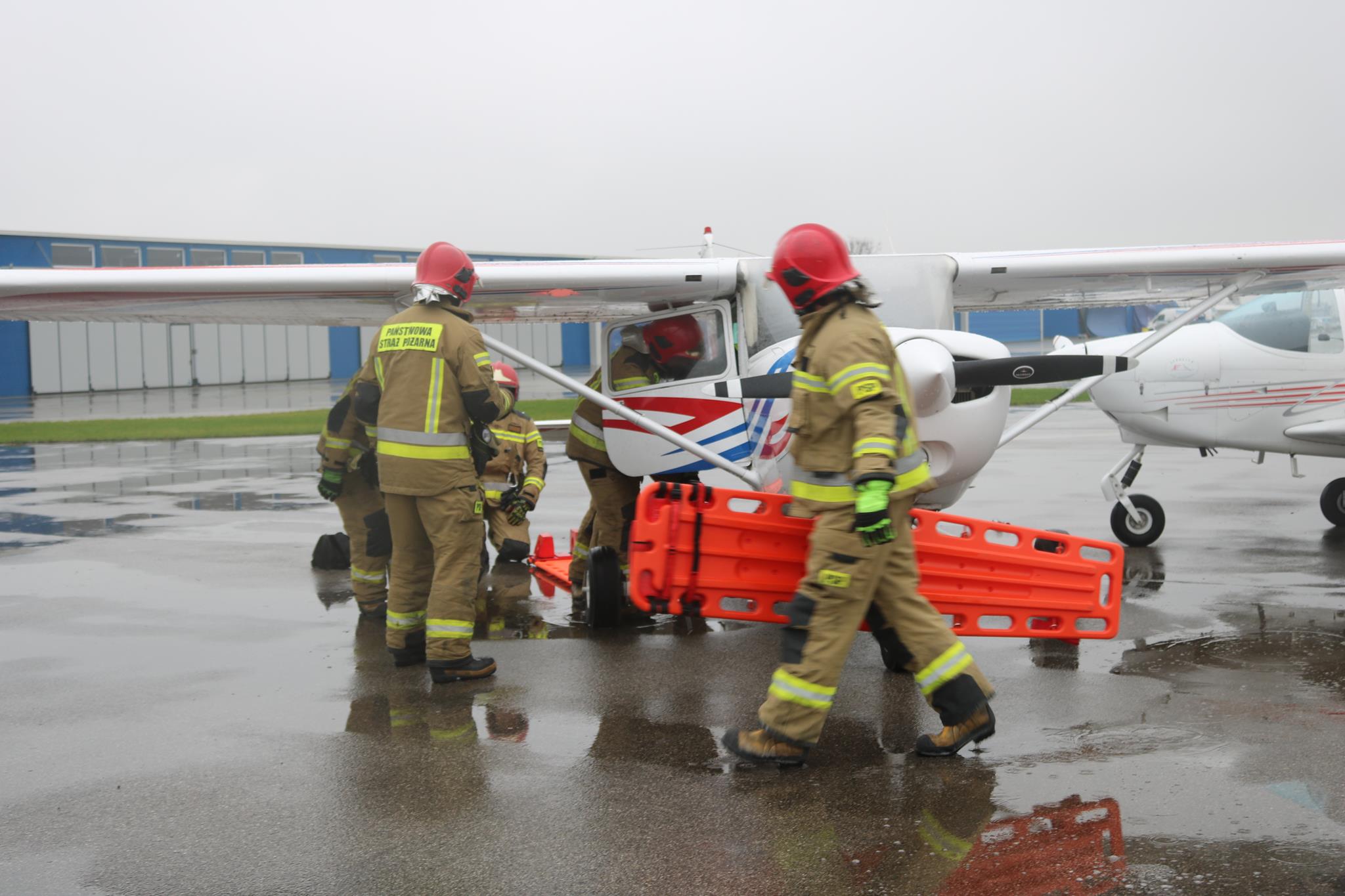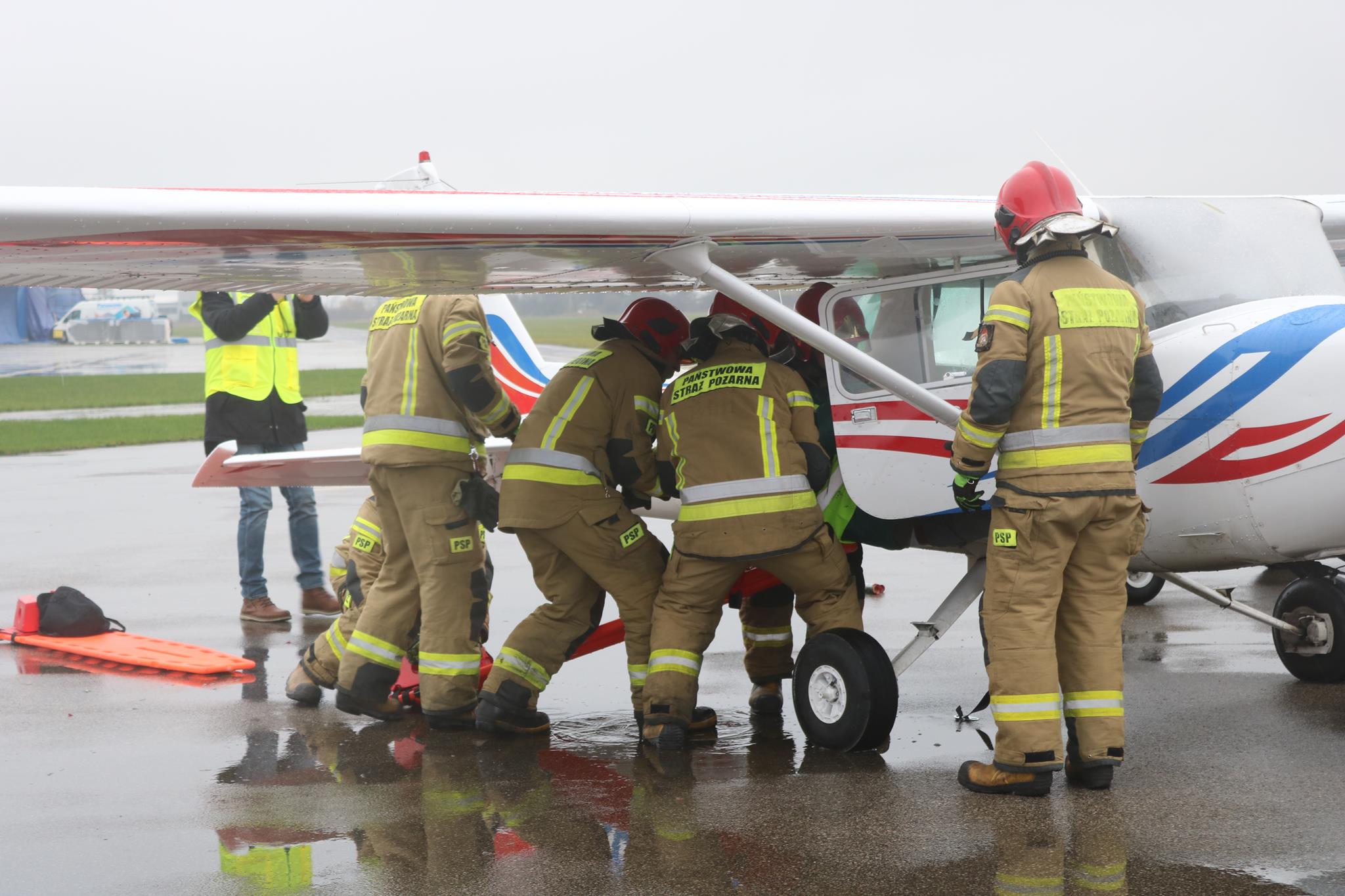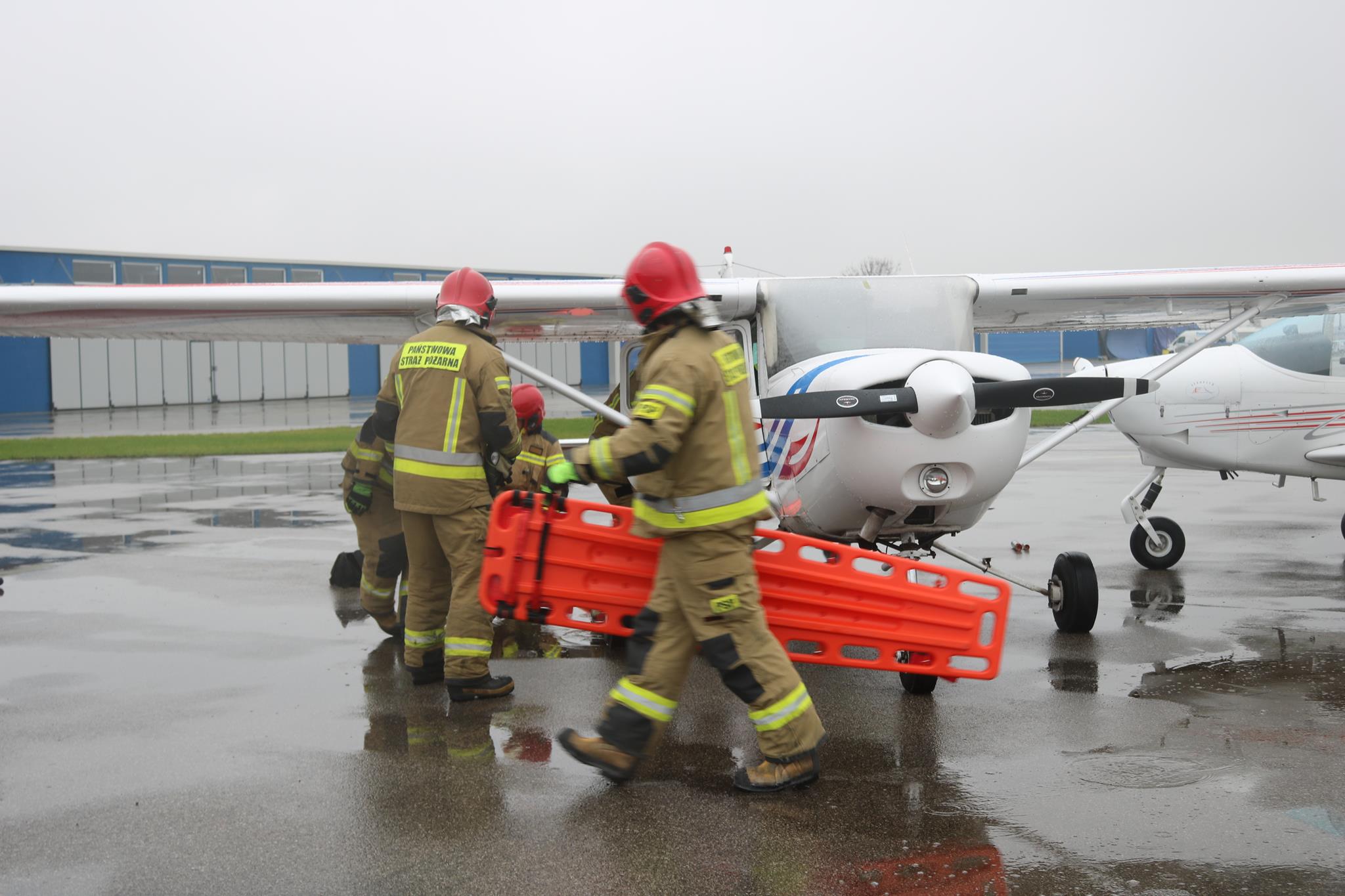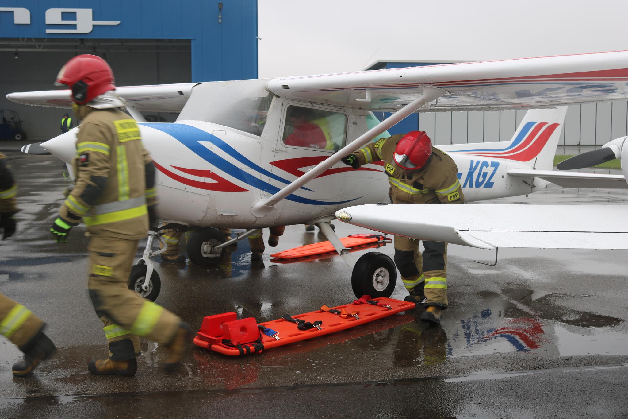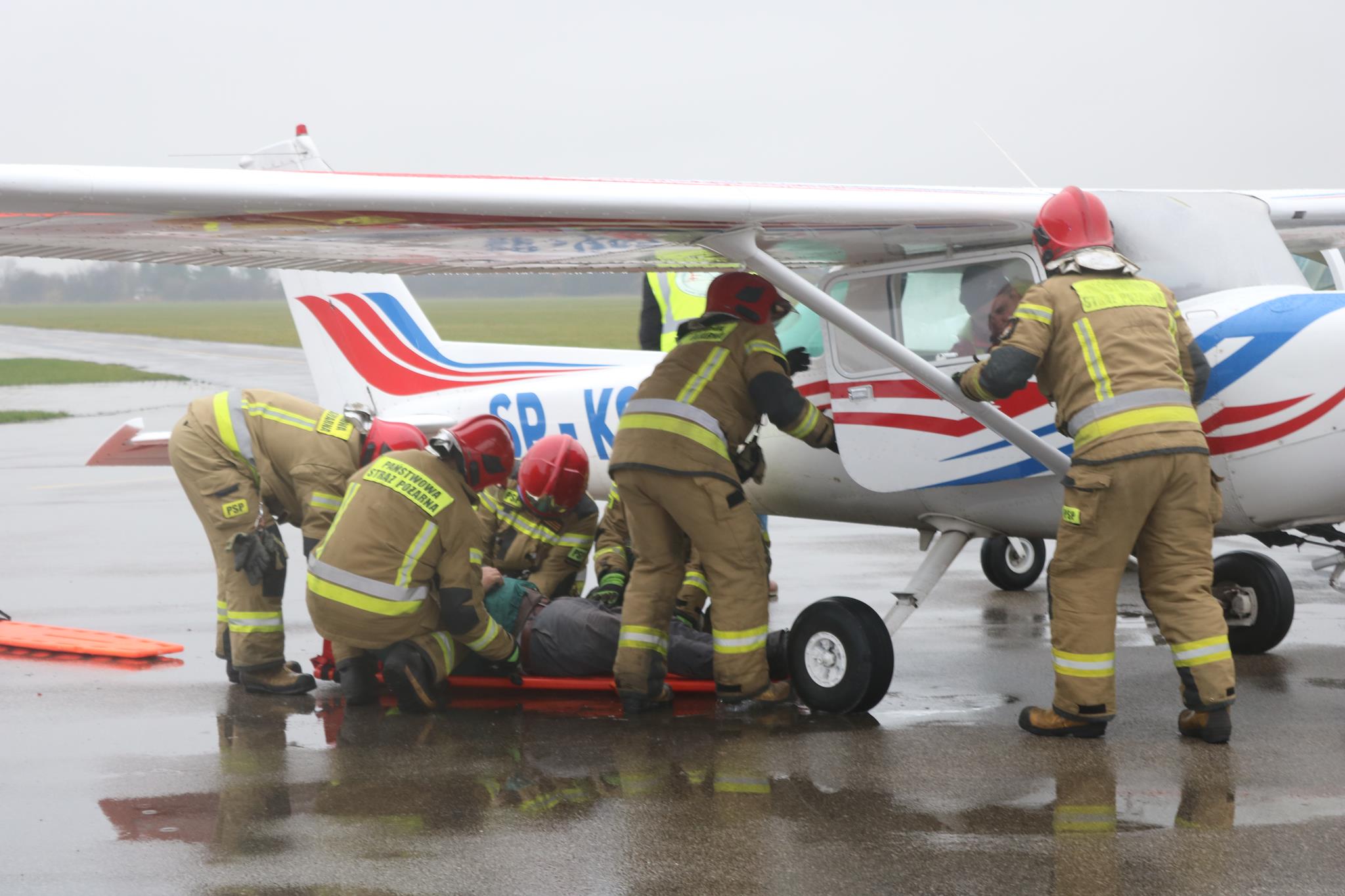 Mały samolot z jedną osobą na pokładzie kołuje do progu pasa, w tym samym czasie do lotniska zbliża się kolejna awionetka z dwiema osobami na pokładzie, która z powodu awarii silnika i niskiej wysokości, musi wykonać awaryjne lądowanie. Samolot nie zdołał dolecieć do pasa i uderza w kołujący drugi statek powietrzny. Oba samoloty z osobami na pokładzie ulegają uszkodzeniu, a znajdujący się w nich piloci odnieśli różnego typu obrażenia – to scenariusz dzisiejszych ćwiczeń, które odbywały się na lotnisku w Piotrkowie.