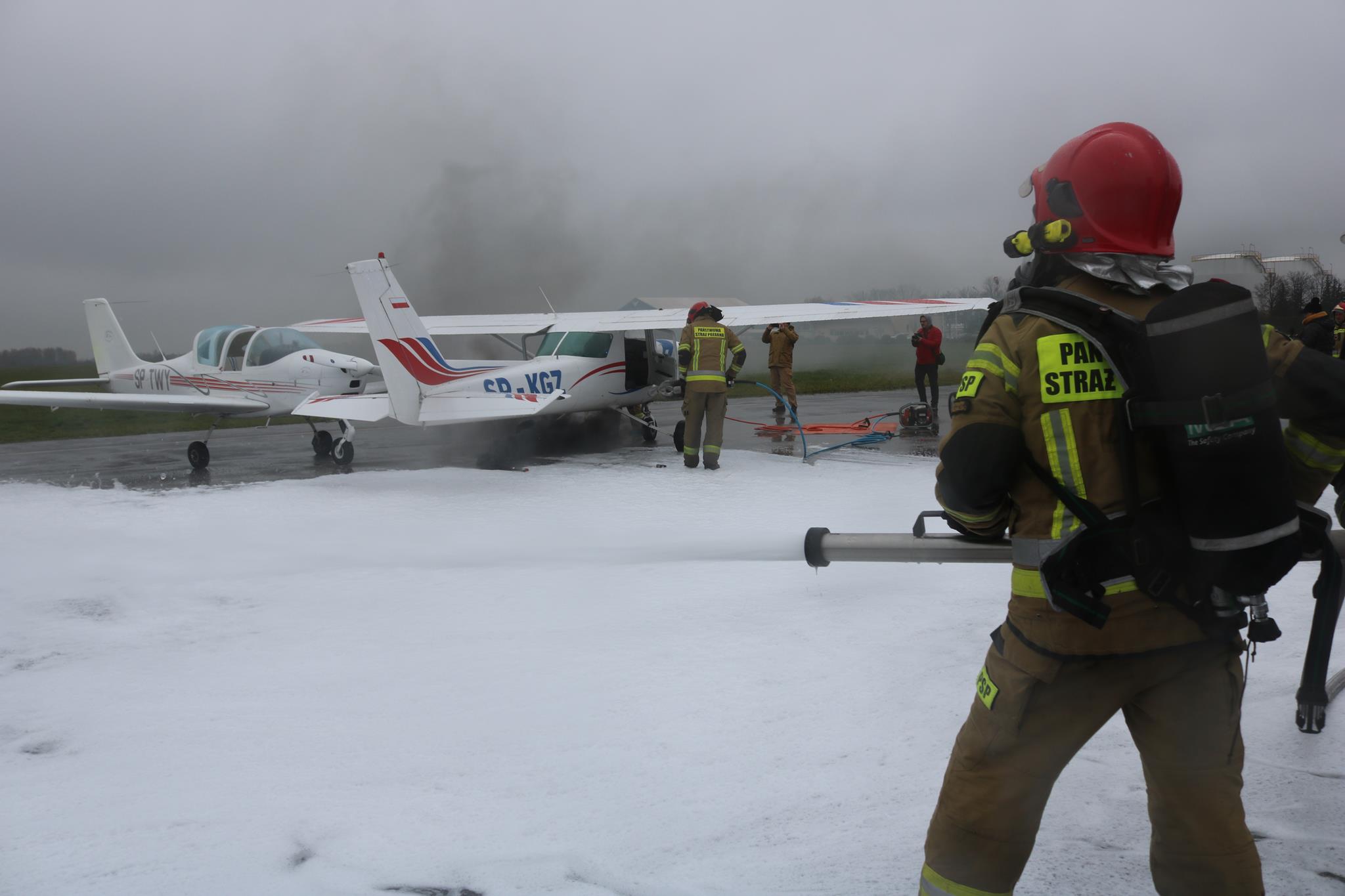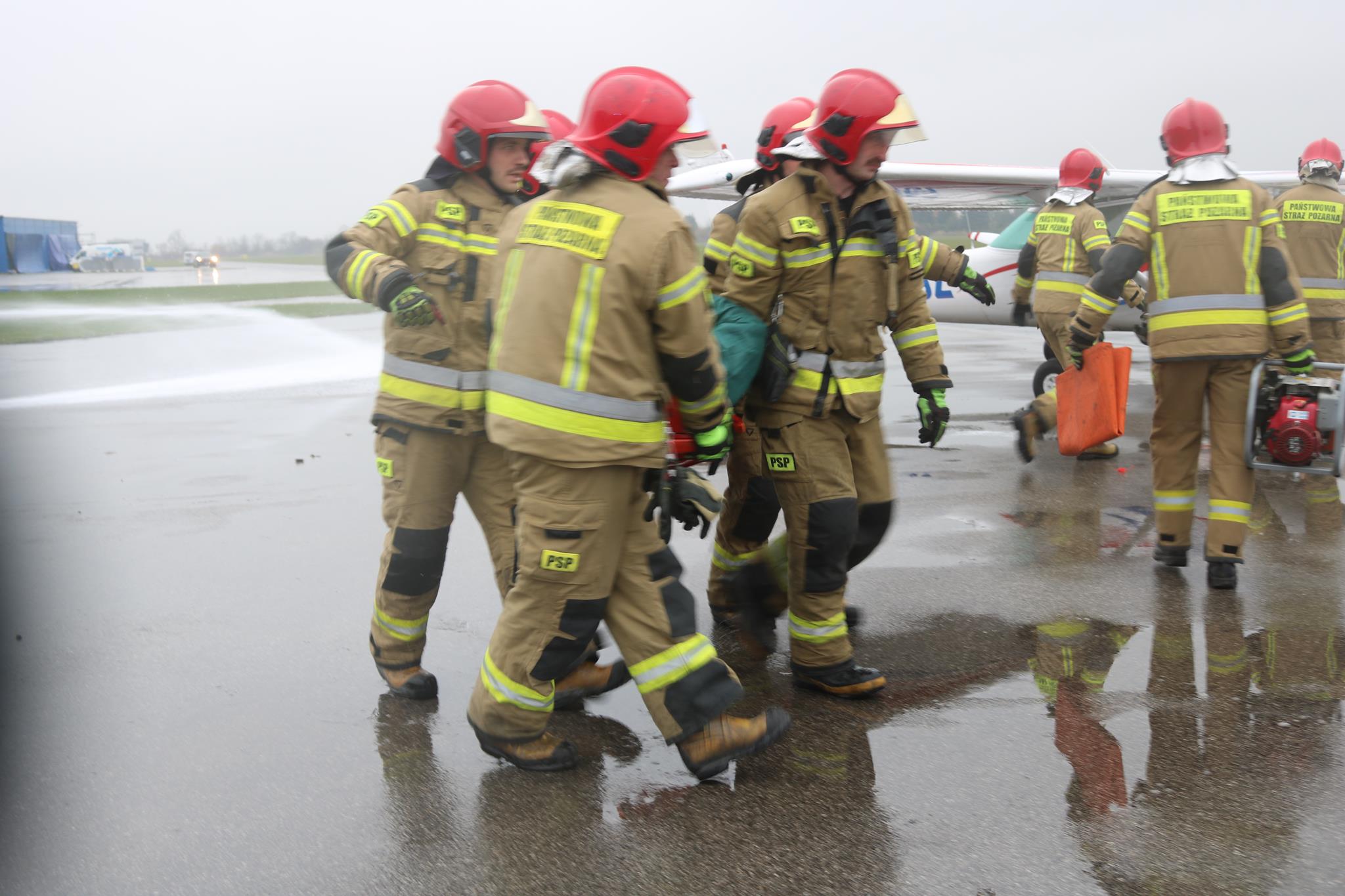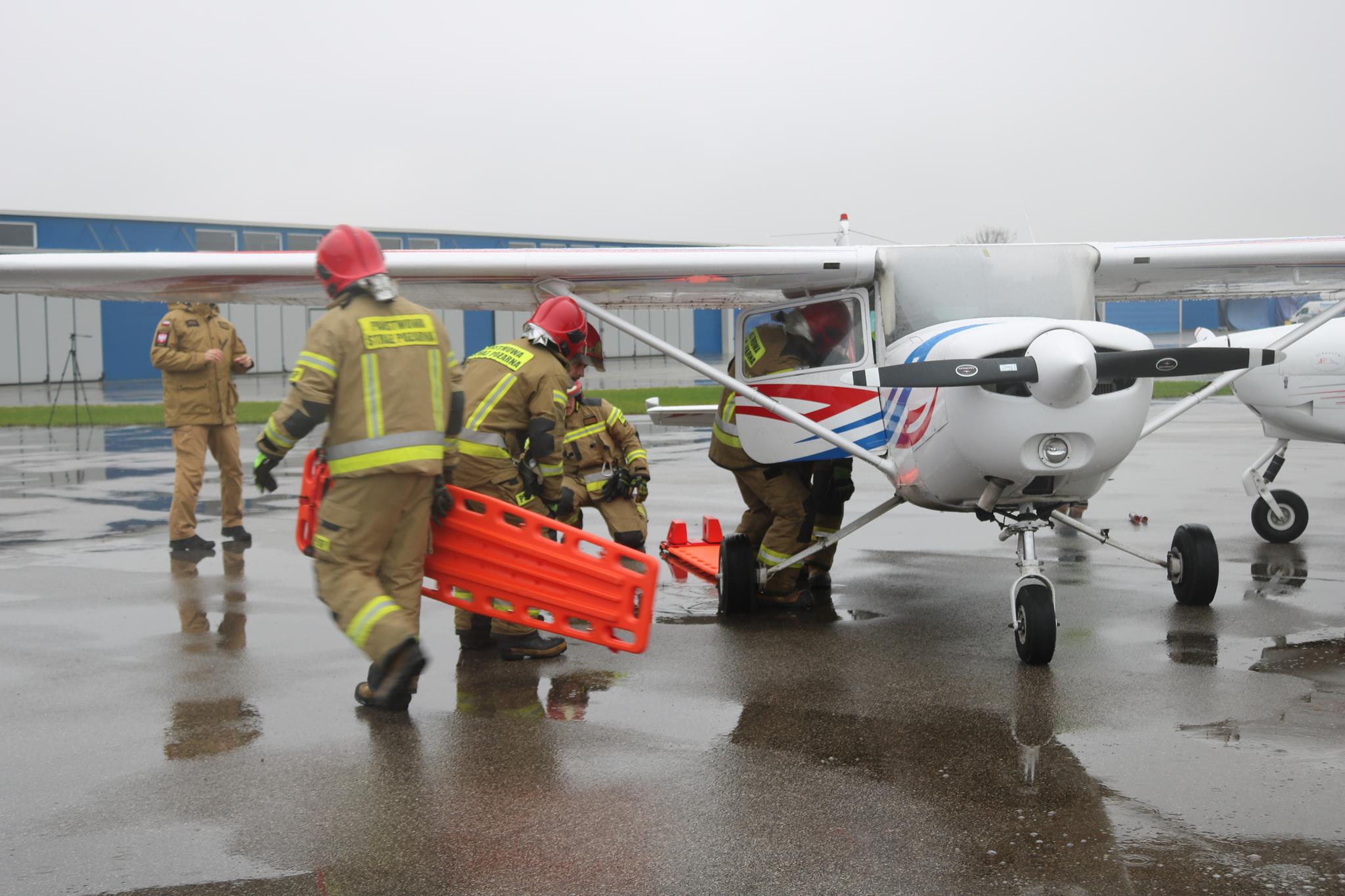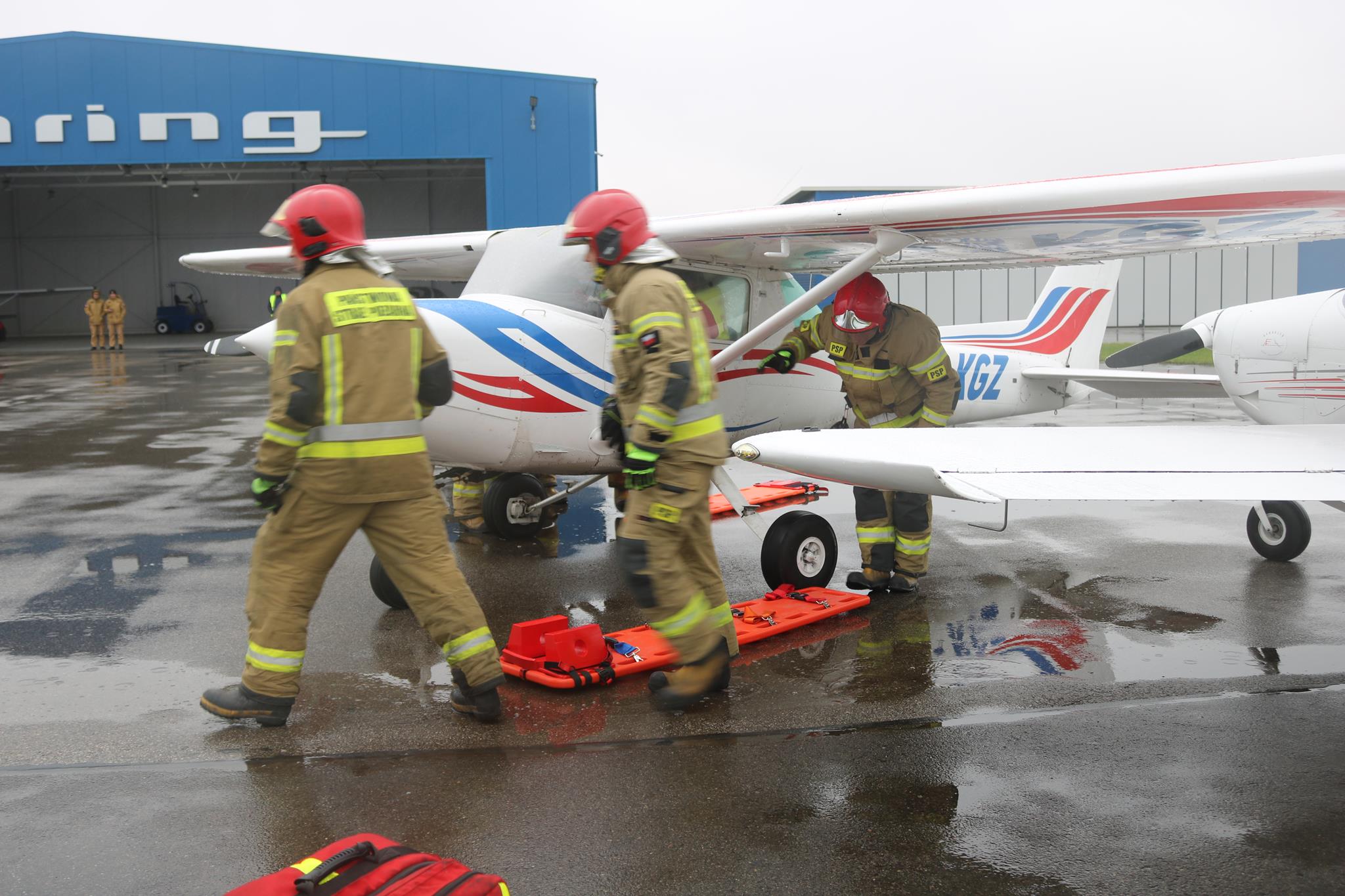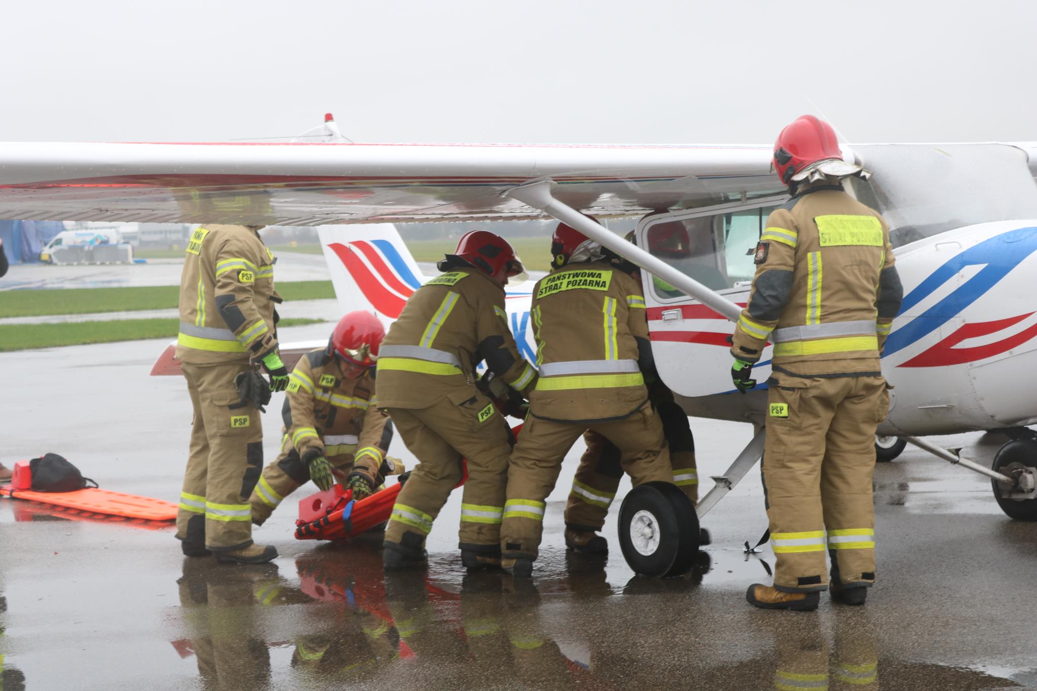 Mały samolot z jedną osobą na pokładzie kołuje do progu pasa, w tym samym czasie do lotniska zbliża się kolejna awionetka z dwiema osobami na pokładzie, która z powodu awarii silnika i niskiej wysokości, musi wykonać awaryjne lądowanie. Samolot nie zdołał dolecieć do pasa i uderza w kołujący drugi statek powietrzny. Oba samoloty z osobami na pokładzie ulegają uszkodzeniu, a znajdujący się w nich piloci odnieśli różnego typu obrażenia – to scenariusz dzisiejszych ćwiczeń, które odbywały się na lotnisku w Piotrkowie.