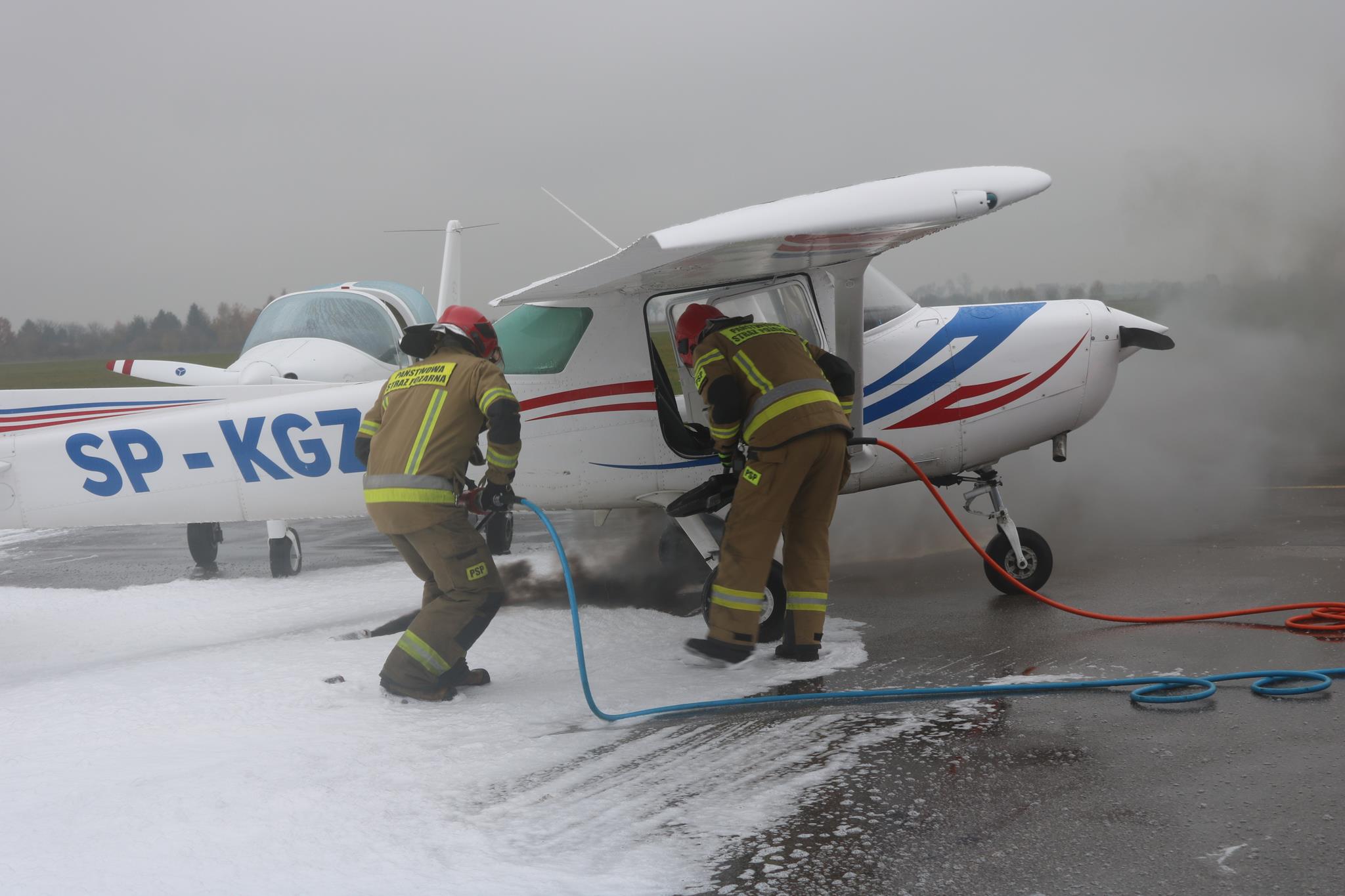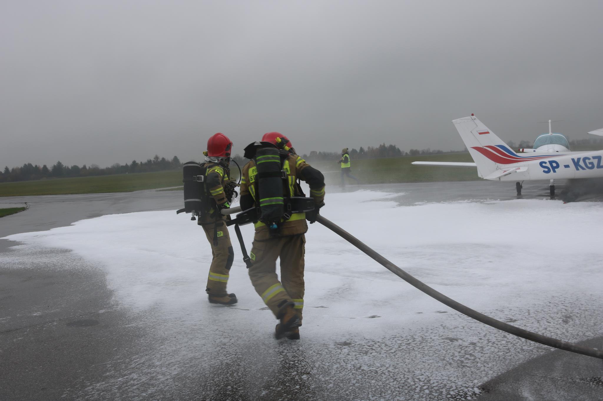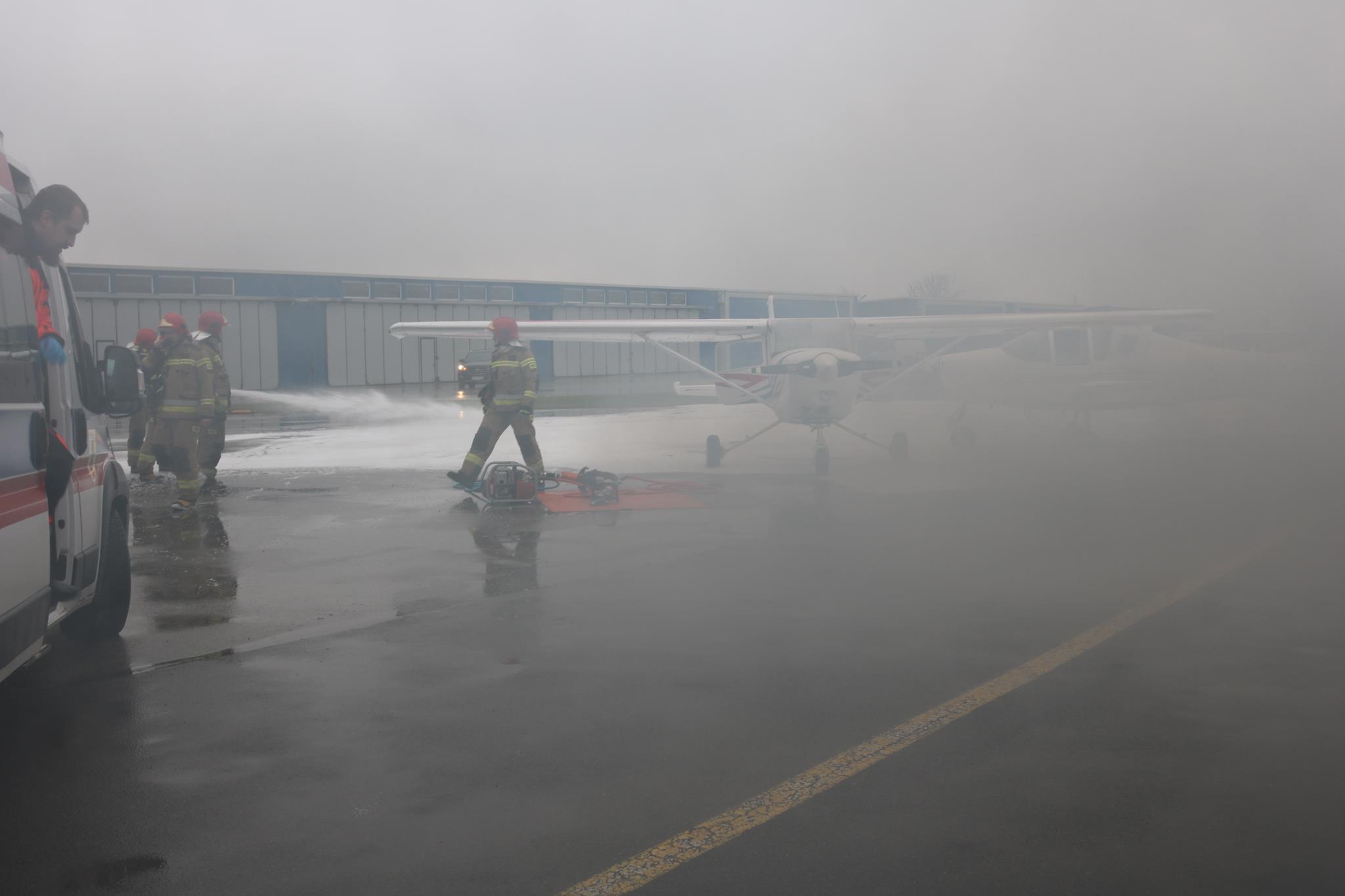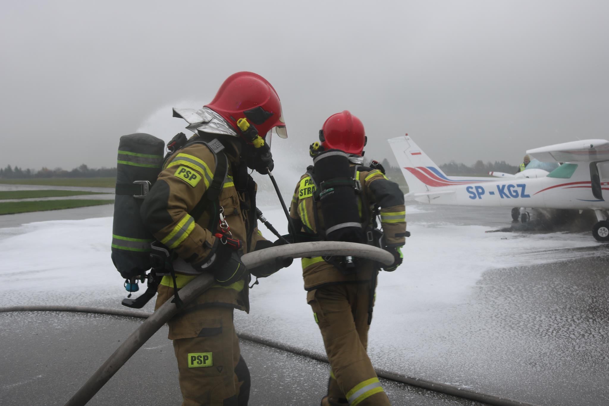 Mały samolot z jedną osobą na pokładzie kołuje do progu pasa, w tym samym czasie do lotniska zbliża się kolejna awionetka z dwiema osobami na pokładzie, która z powodu awarii silnika i niskiej wysokości, musi wykonać awaryjne lądowanie. Samolot nie zdołał dolecieć do pasa i uderza w kołujący drugi statek powietrzny. Oba samoloty z osobami na pokładzie ulegają uszkodzeniu, a znajdujący się w nich piloci odnieśli różnego typu obrażenia – to scenariusz dzisiejszych ćwiczeń, które odbywały się na lotnisku w Piotrkowie.