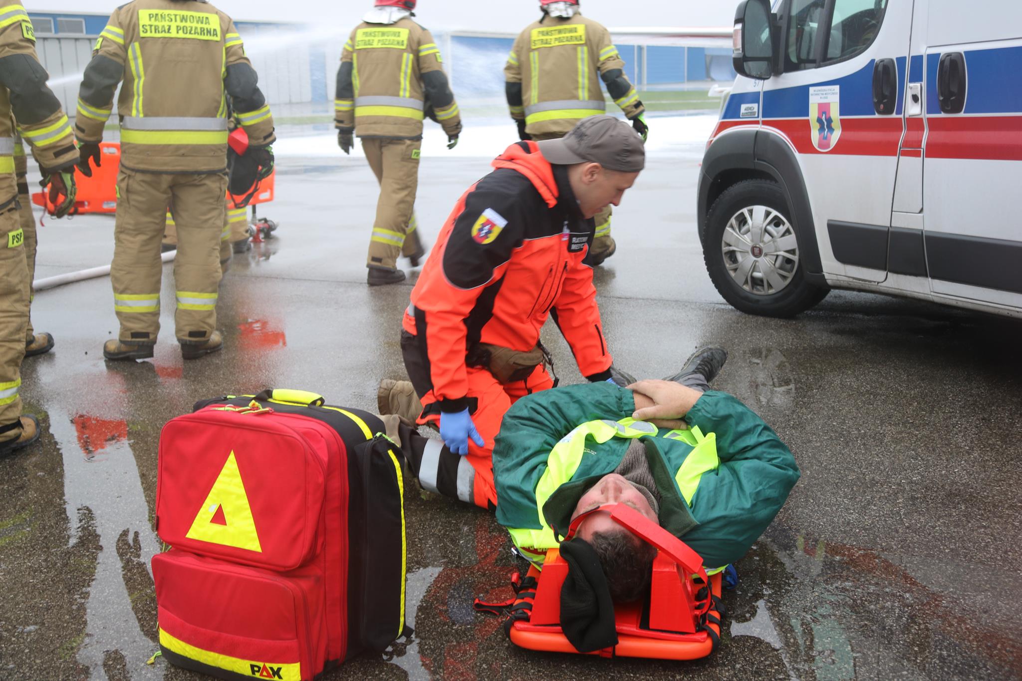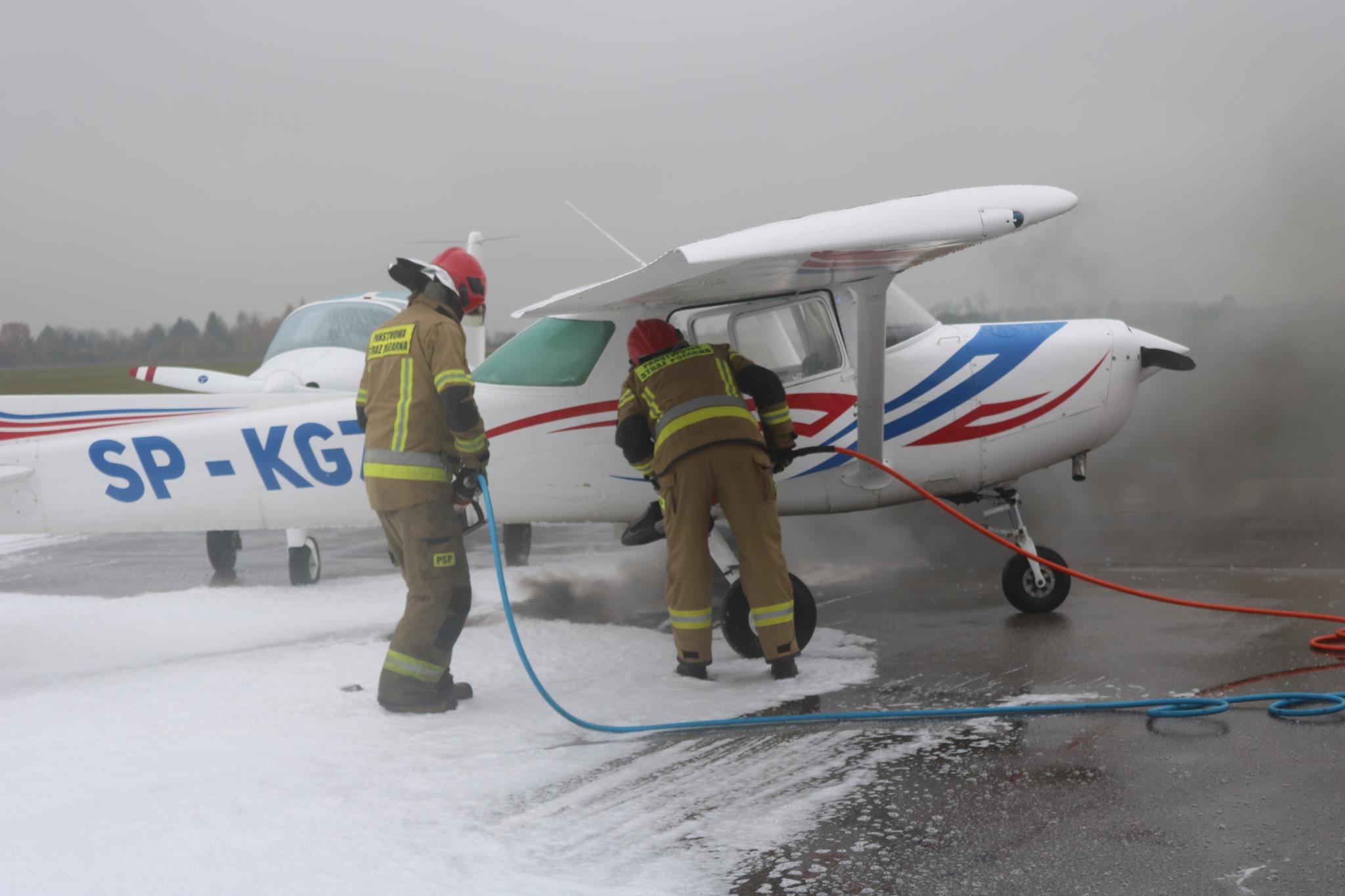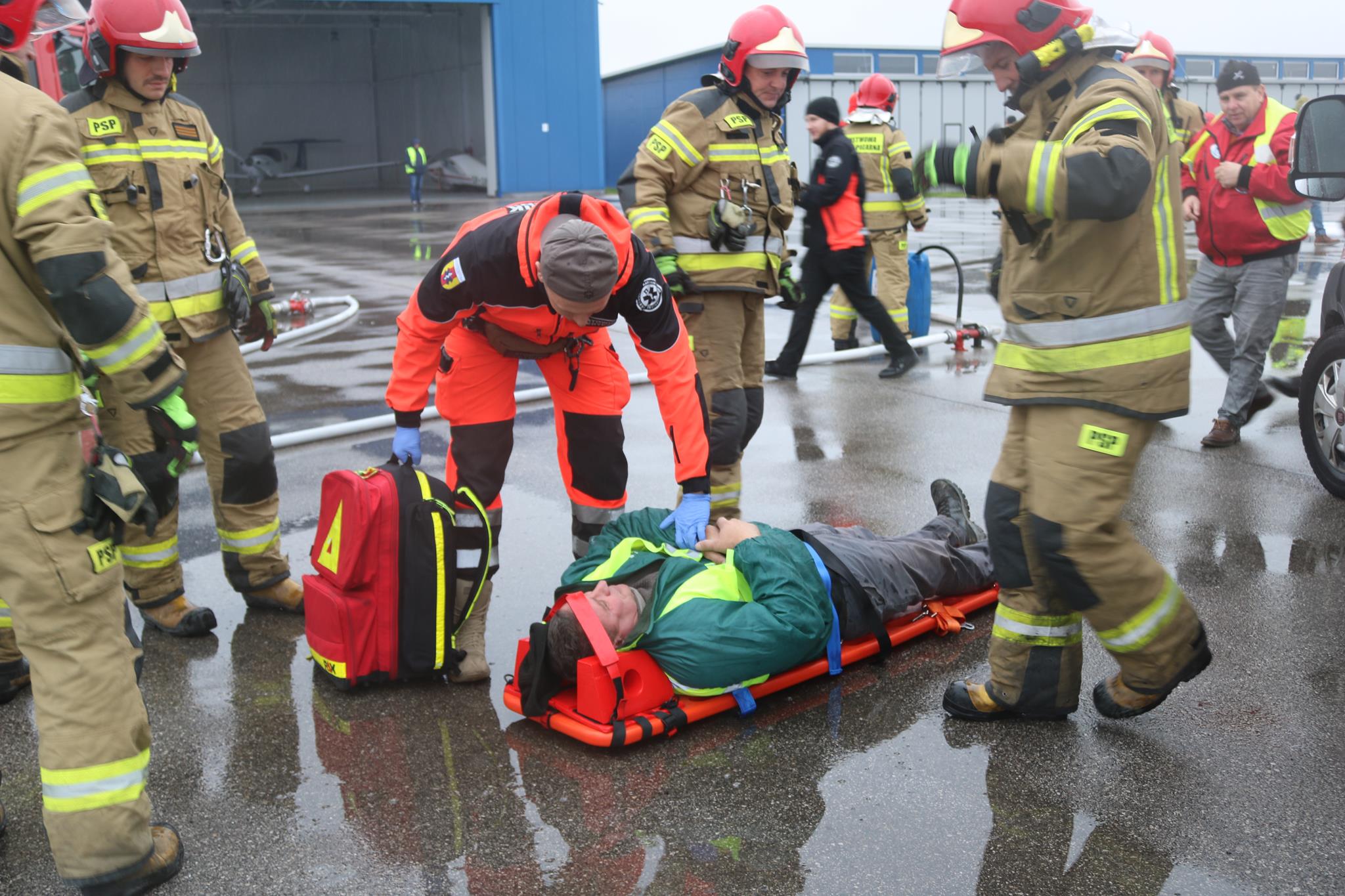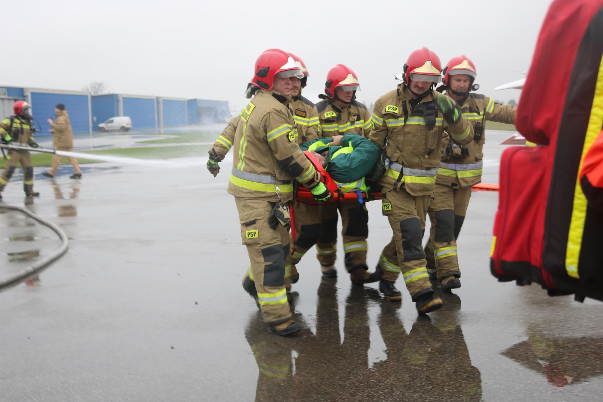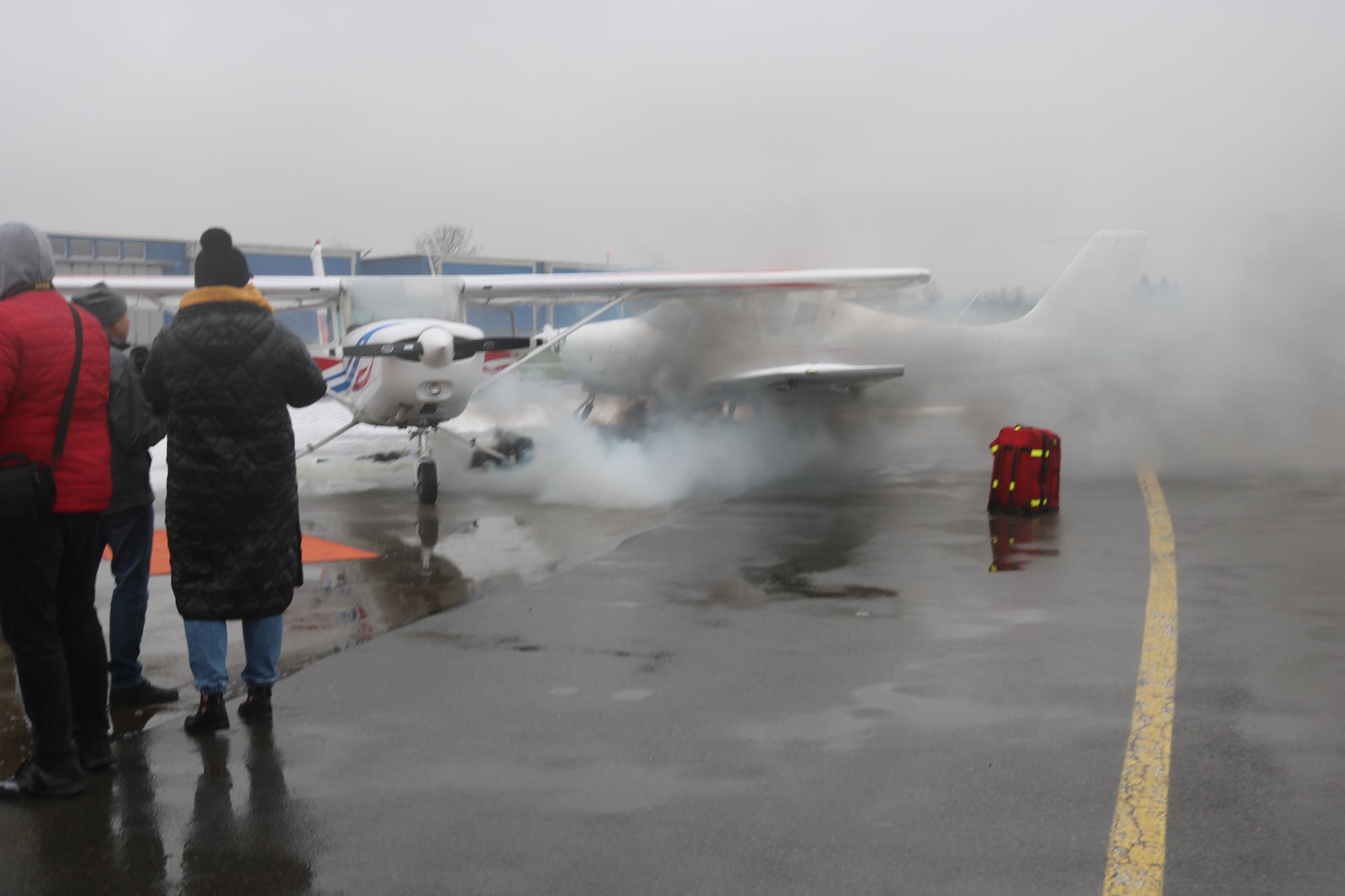 Mały samolot z jedną osobą na pokładzie kołuje do progu pasa, w tym samym czasie do lotniska zbliża się kolejna awionetka z dwiema osobami na pokładzie, która z powodu awarii silnika i niskiej wysokości, musi wykonać awaryjne lądowanie. Samolot nie zdołał dolecieć do pasa i uderza w kołujący drugi statek powietrzny. Oba samoloty z osobami na pokładzie ulegają uszkodzeniu, a znajdujący się w nich piloci odnieśli różnego typu obrażenia – to scenariusz dzisiejszych ćwiczeń, które odbywały się na lotnisku w Piotrkowie.