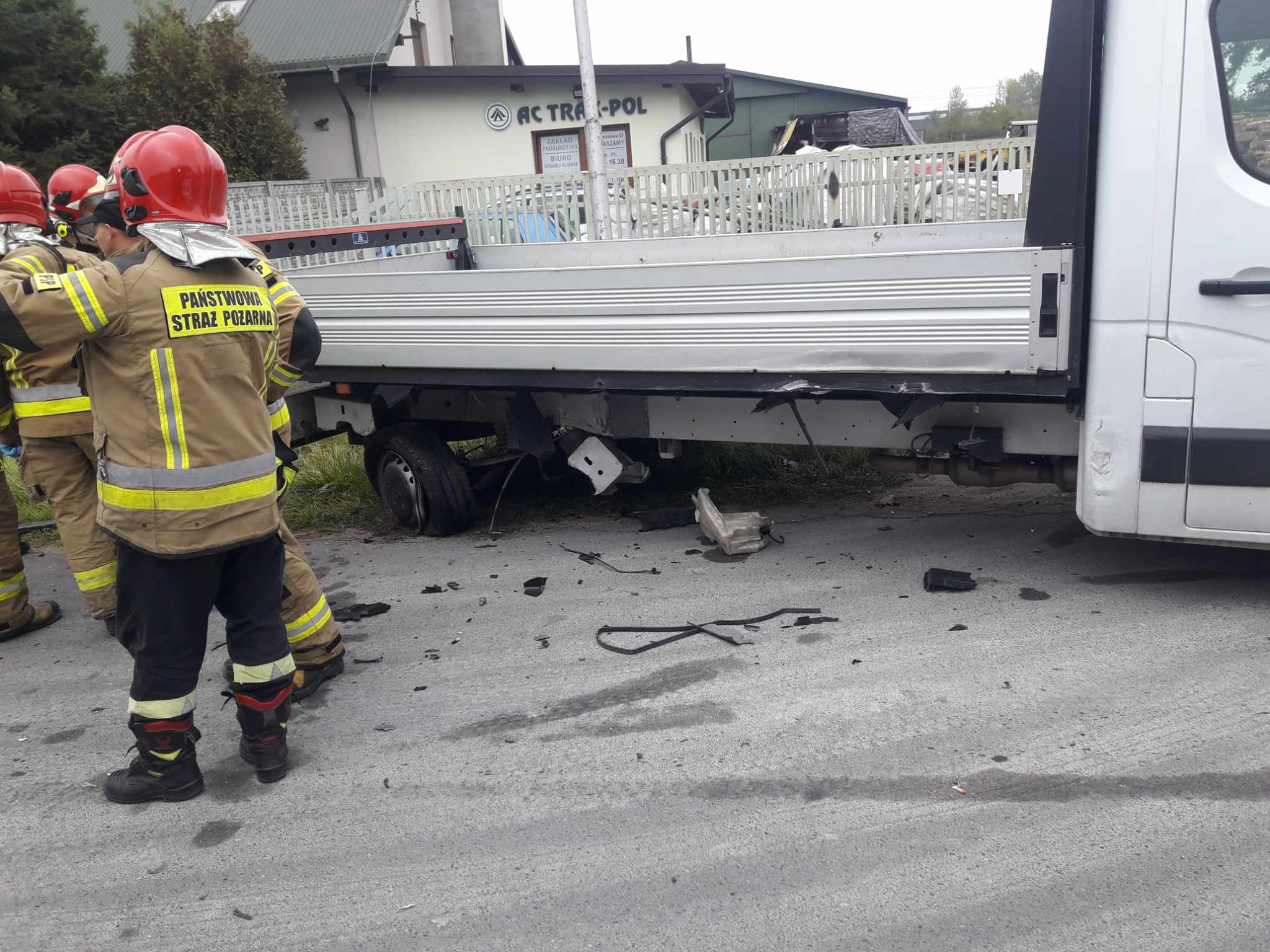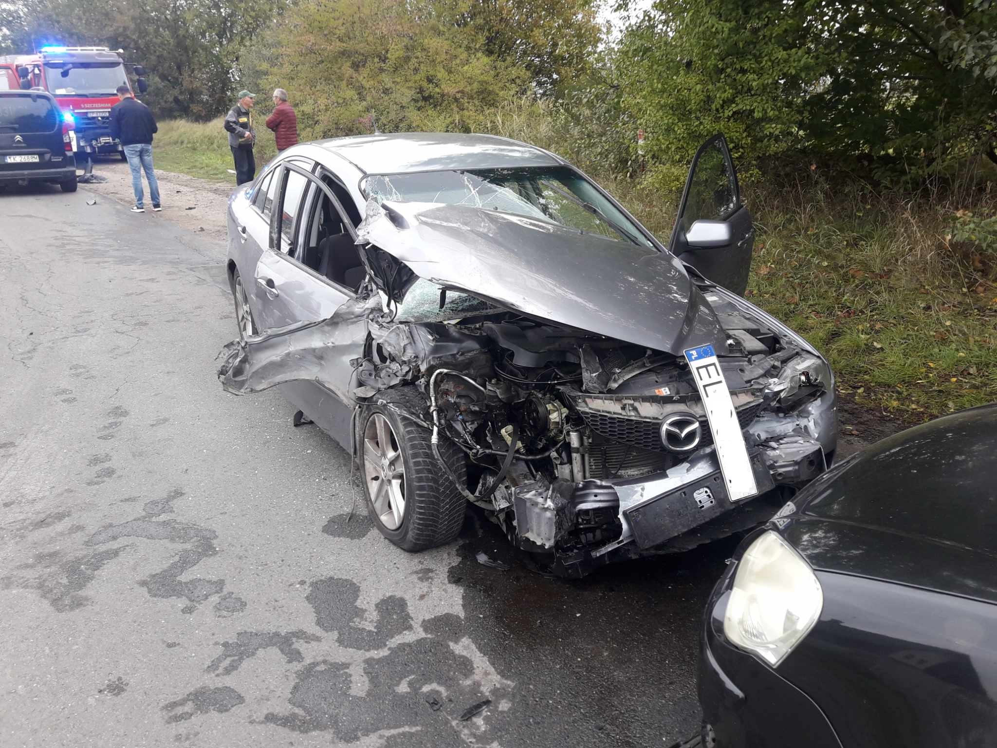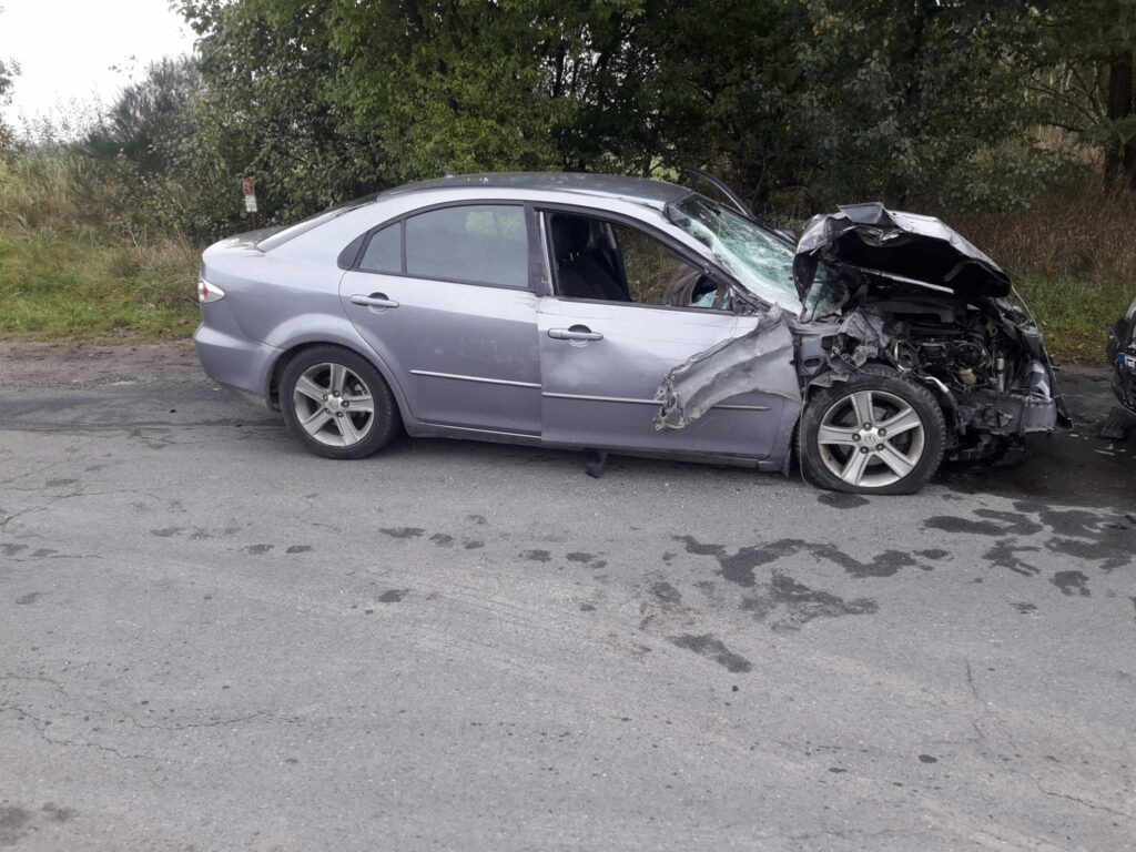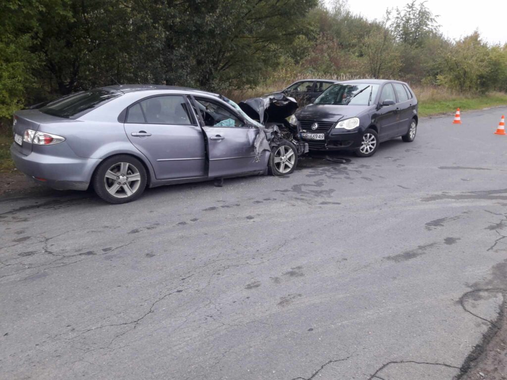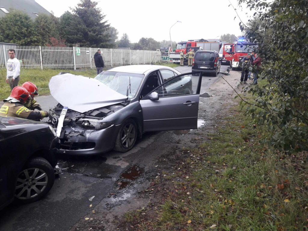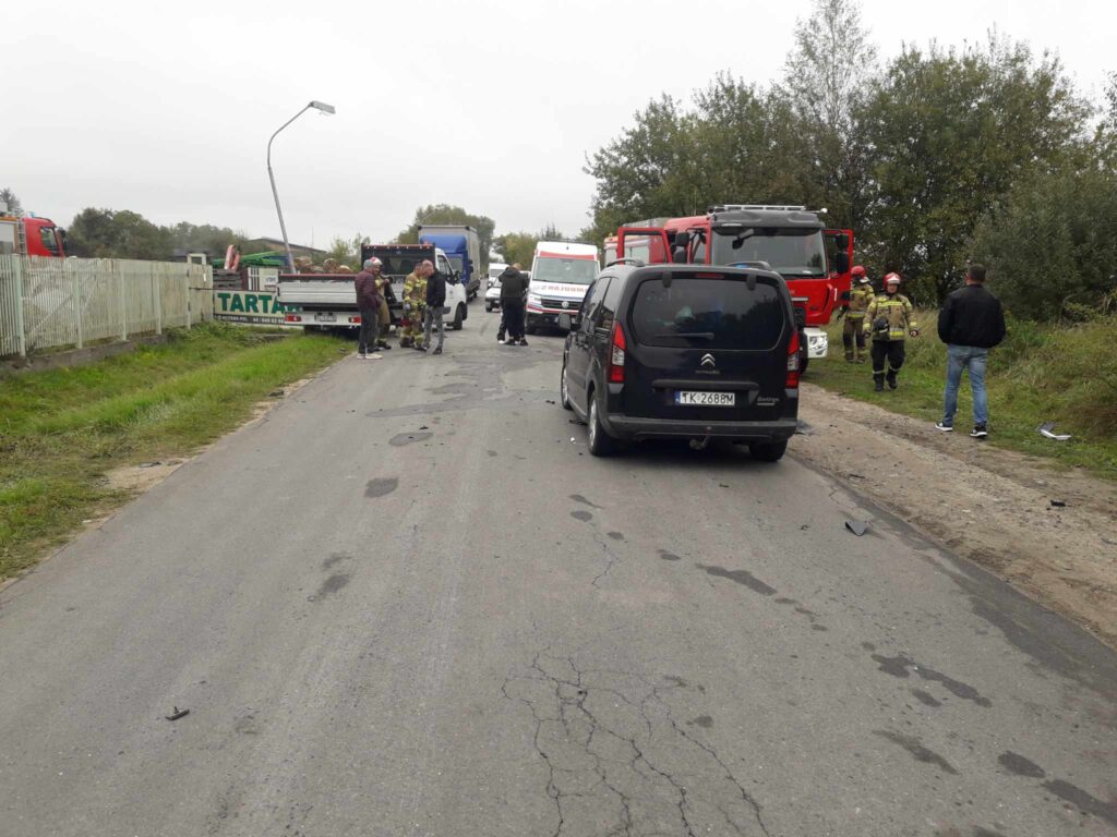 Zderzyły się dwie osobówki i samochód dostawczy. Z naszych informacji wynika, że kierujący dostawczakiem jechał od strony ulicy Moryca i chciał skręcić w lewo, do tartaku. Od strony miasta jechała mazda, która uderzyła w bok auta. Siła uderzenia wyrwała część koła samochodu dostawczego. Mazda siłą rozpędu przejechała jeszcze kawałek i zderzyła się z nadjeżdżającym z przeciwka volkswagenem i citroenem.