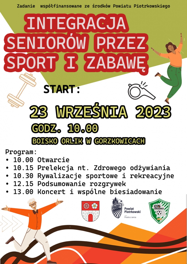 „Integracja seniorów przez sport i zabawę” – wydarzenie organizuje Gminny Uczniowski Klub Sportowy z Gorzkowic. Na uczestników czeka mnóstwo atrakcji. Impreza jest realizowana przy wsparciu samorządu powiatu piotrkowskiego, a odbędzie się już 23 września od 10.00 na boisku Orlik w Gorzkowicach. Zgłoszenia przyjmowane są mailowo: promocja@gorzkowice.pl