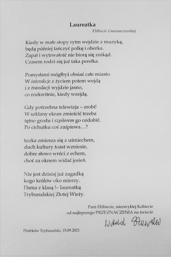 W miniony czwartek 16 września w salach Muzeum w Piotrkowie Trybunalskim odbyło się uroczyste wręczenie statuetki Złota Wieża Trybunalska. Laureatką 46 edycji konkursu została pani Elżbieta Gniewaszewska. Treść uzasadnienia dostępna jest tu: http://www.tppt.pl/laureaci.html