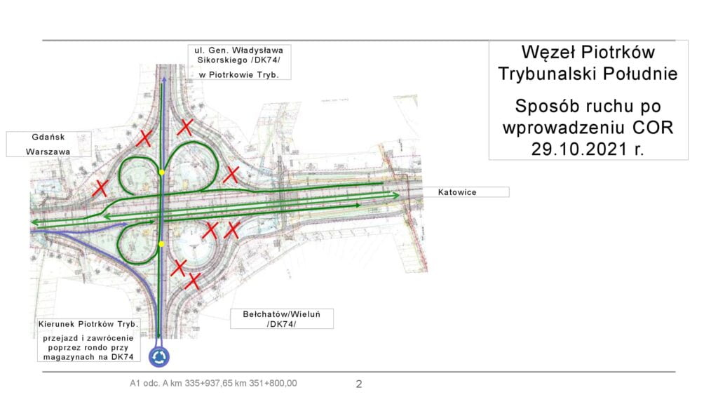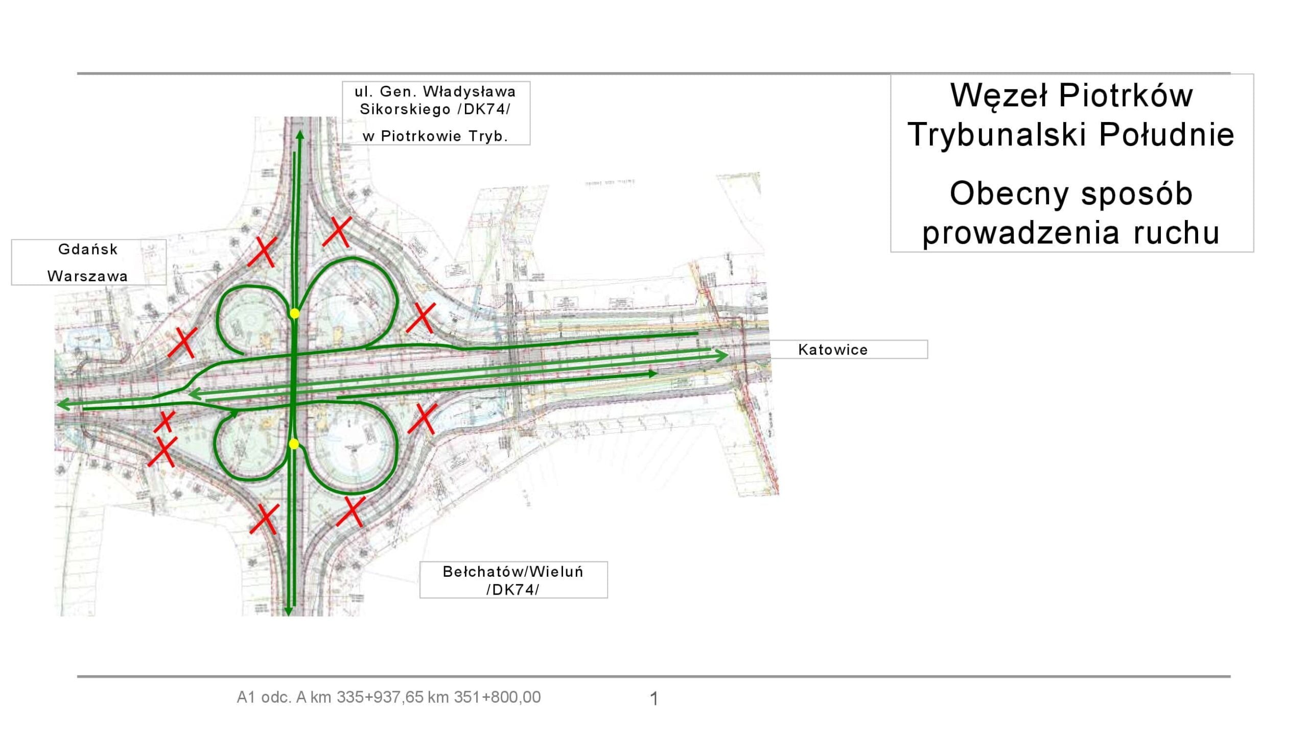 Z kolei jadący od strony Łodzi i Katowic do Piotrkowa Trybunalskiego będą musieli przemieścić się drogą krajową 74j do ronda po zachodniej stronie węzła (obok magazynów), tam zawrócić (obrazują to załączone grafiki) i pojechać ulicą Generała Sikorskiego w Piotrkowie Trybunalskim.
