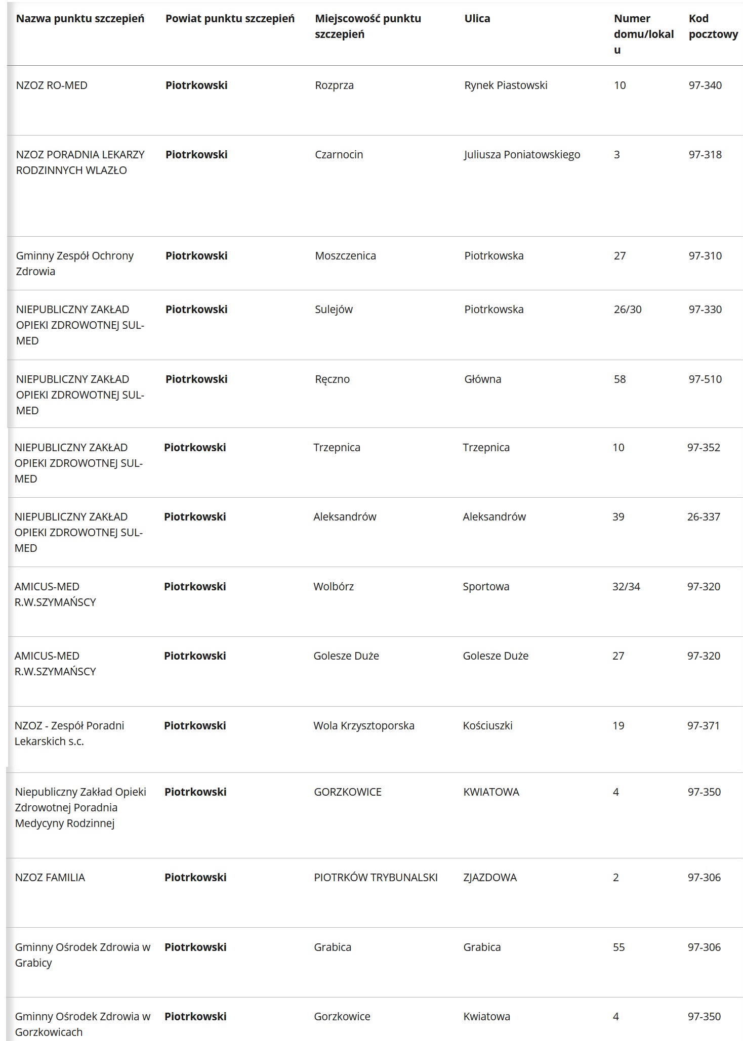 Zgodnie z narodowym programem szczepień ochronnych, punkt szczepień uruchomiono w każdej gminie. Poniżej lista punktów szczepień w Piotrkowie Trybunalskim i powiecie piotrkowskim.