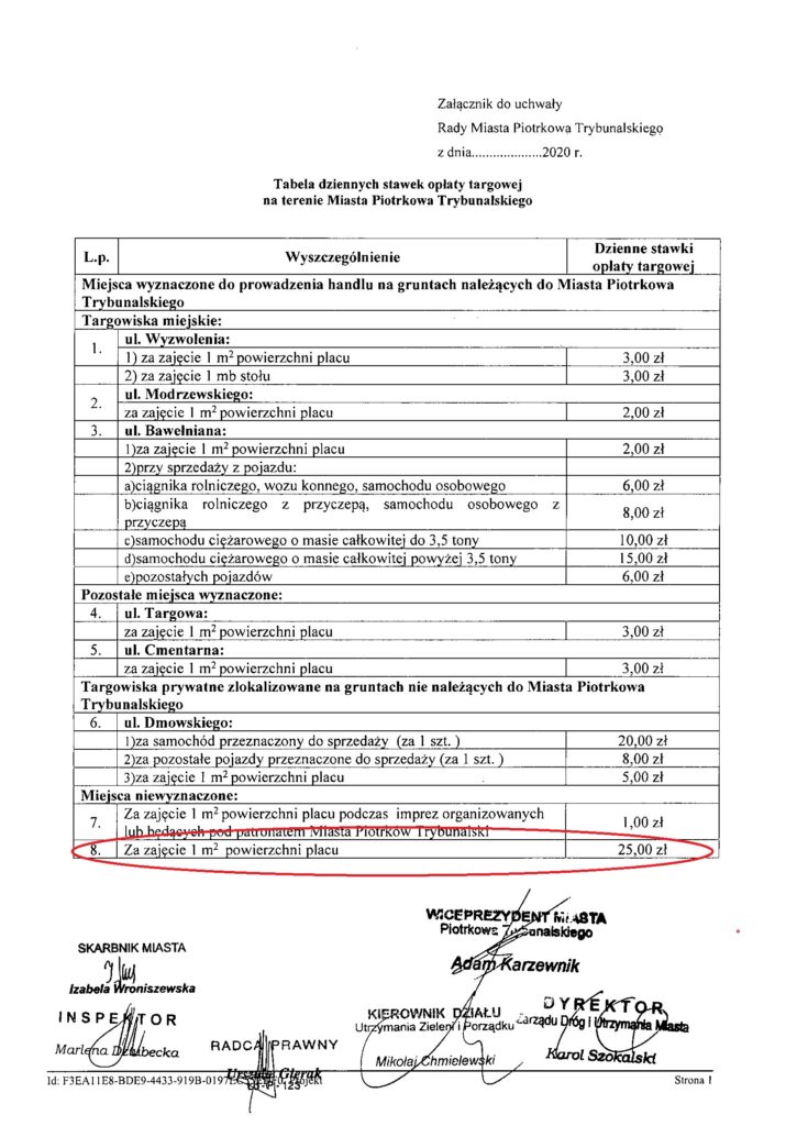 Podczas najbliższej sesji, radni mają zająć się także zmianami w cenniku opłat targowych. Zmiana jest tylko jedna, wydawałoby się „kosmetyczna”, ale za to niezwykle kosztowna. Projekt zmian zakłada wyłączenie najbliższych terenów wokół Hali (chodzi o teren prywatnego targowiska firmy WBH-a Staszor SJ.) z targowisk miejskich, co skutkować będzie tym, że opłata za metr kwadratowy powierzchni do handlu podskoczy tam z 3 zł. (trzy złote) do… 25 zł! (dwadzieścia pięć).