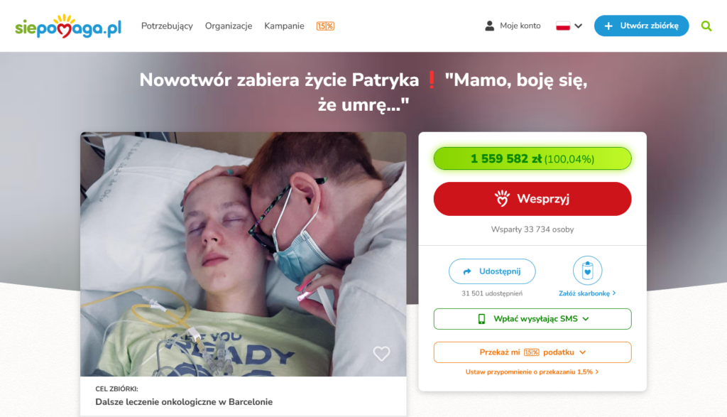 Patryka wsparły 33 734 osoby. To już druga zbiórka w serwisie internetowym. Poprzednio udało się zebrać 2 163 012 zł